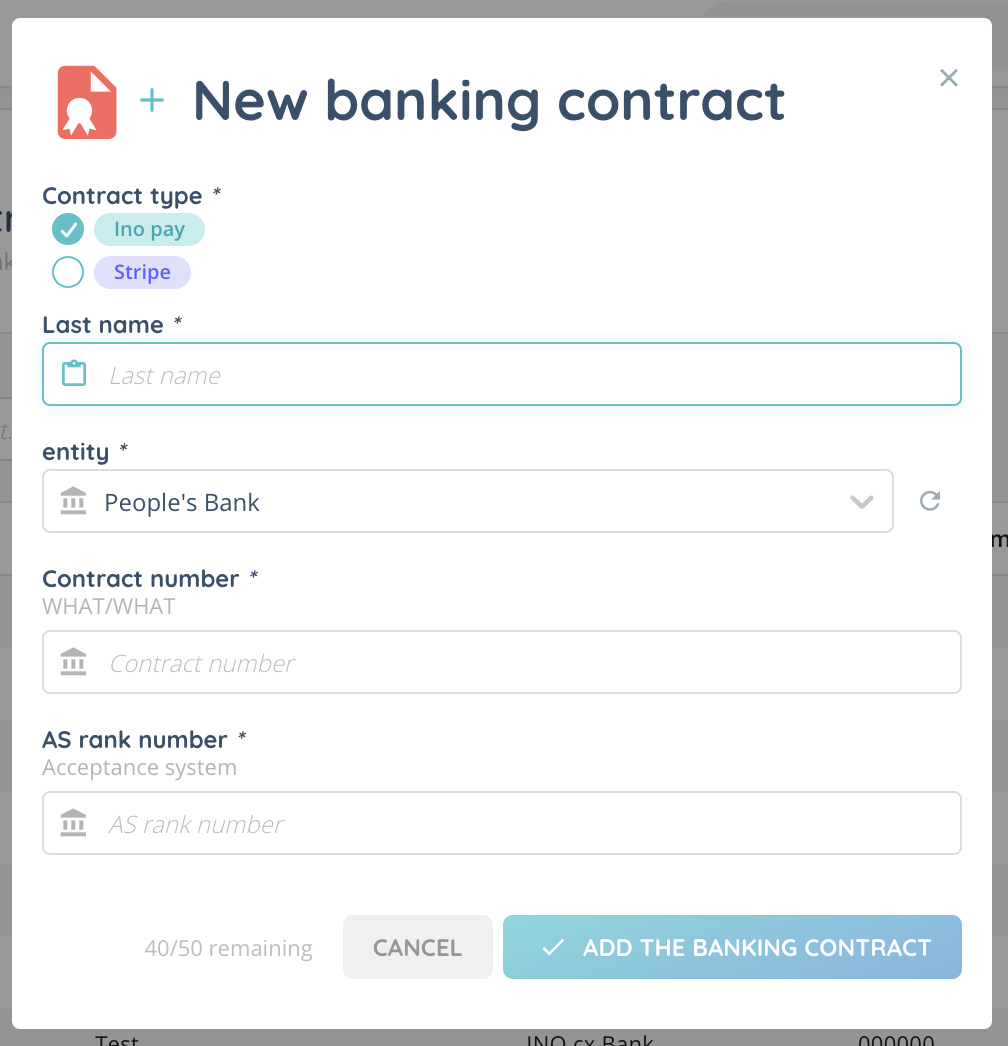 Once the contract is created, an automatic check will be performed: if the data entered correspond to an existing bank or Stripe contract, the contract will become active.