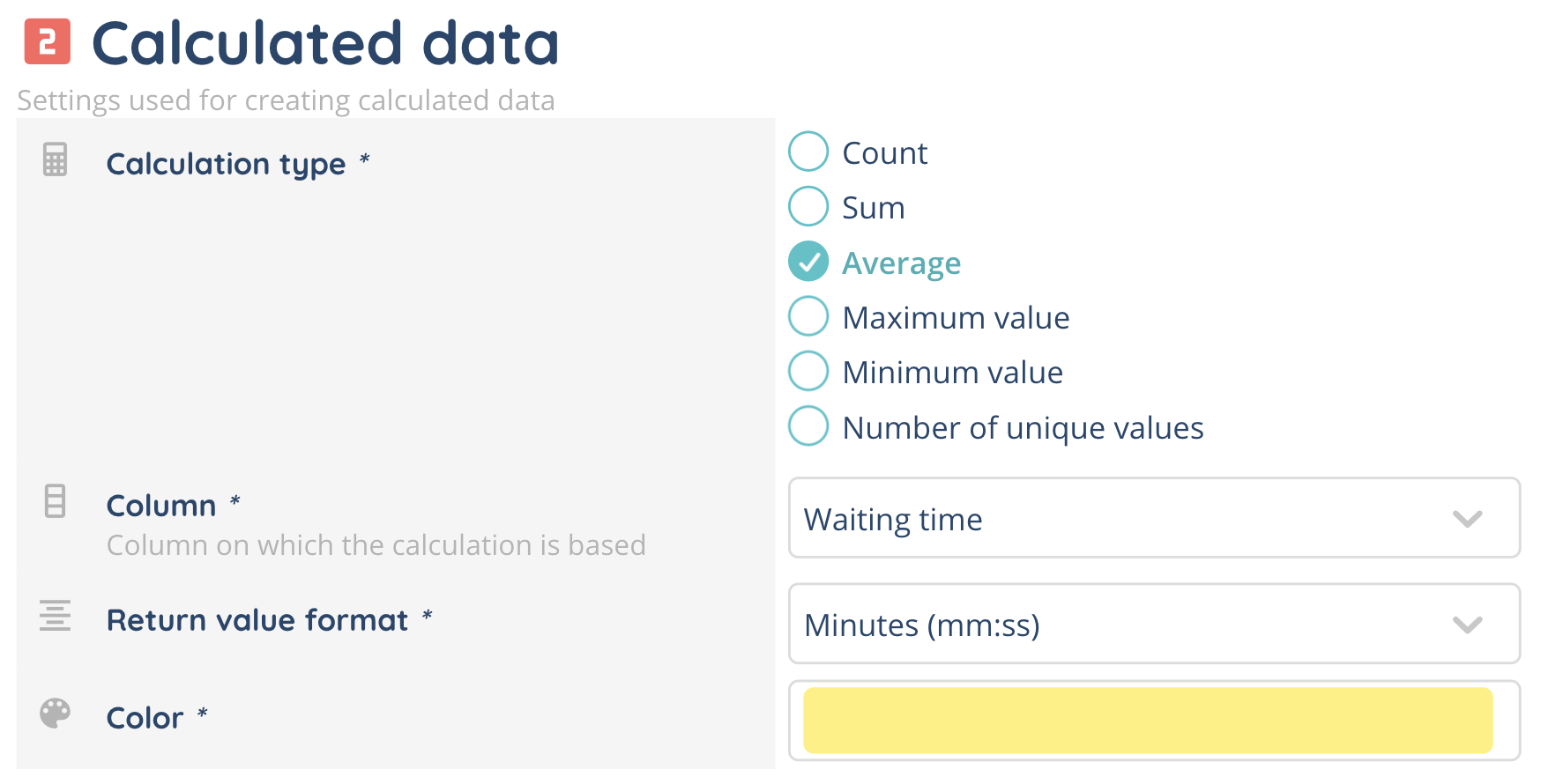 This data type, shown in turquoise in the items table, allows you to perform a simple calculation (sum, average, minimum, maximum, etc.) on a raw data column.