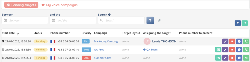 The Pending targets tab displays all targets with the status Pending for the voice campaigns included in the active profile.