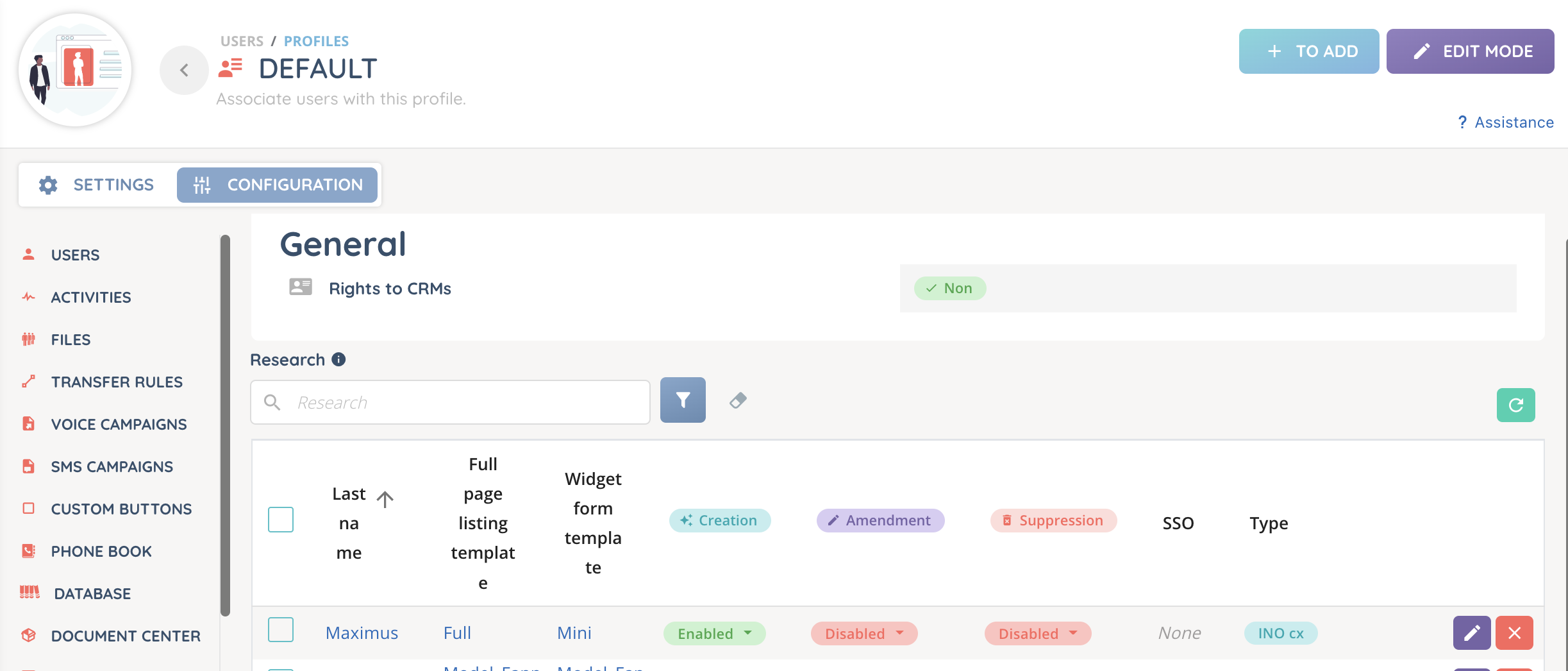 As with the knowledge base, directories and cases, access to CRMs is granted or revoked in the “Configuration” tab of the profile. The display in the Banner will change according to the CRM(s) linked to each profile: it is entirely possible to have multiple CRMs for different types of customers and needs.