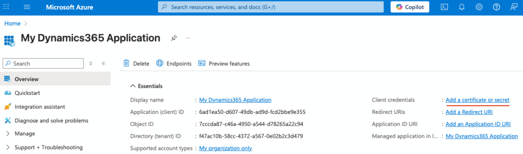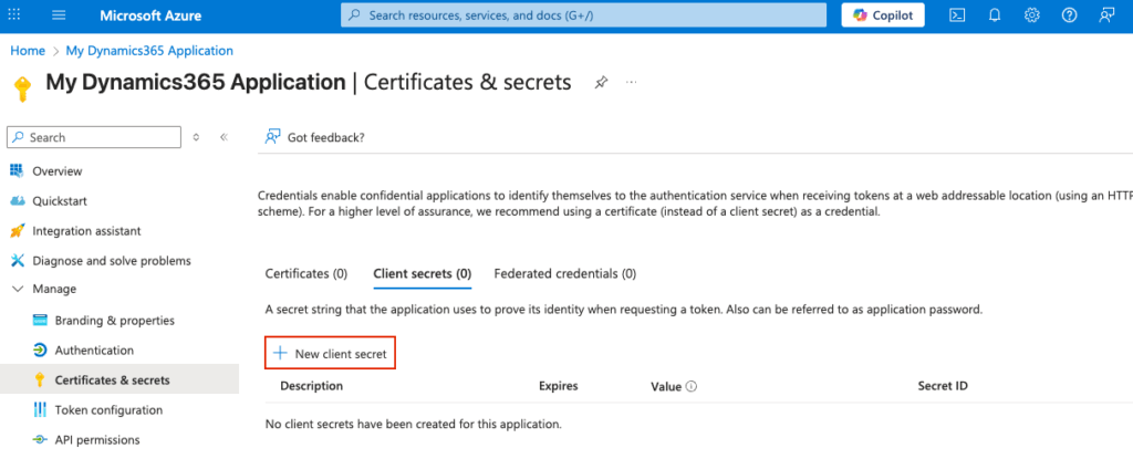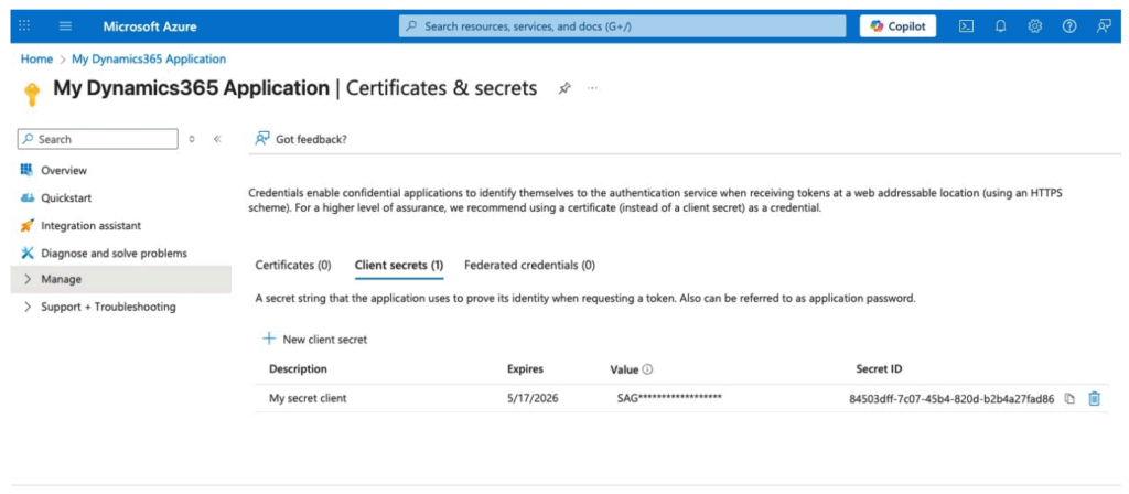 Azure will display the Secret client (Value column) only once. Make sure to store it securely.