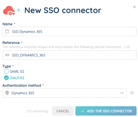 Create a new SSO connector using the Dynamics 365 authentication method created earlier.