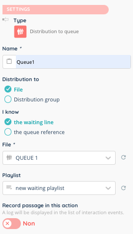 This action allows you to select a queue or a distribution group that you have set up beforehand. It is also possible to do it either by their reference.