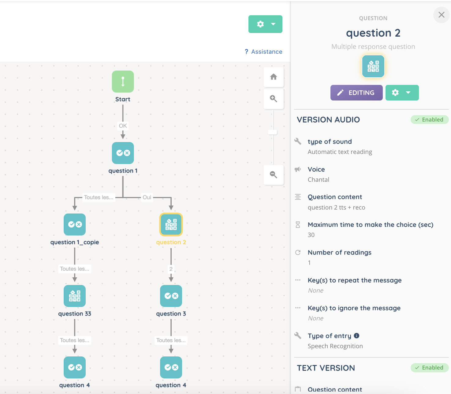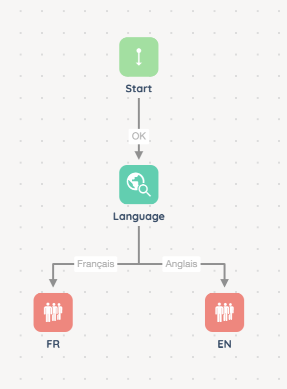 With this action, you can direct a client to a survey that you have previously created in the Maker during the post-interaction. Surveys’ philosophy is a bit like Smart routings’, with multiple branches.