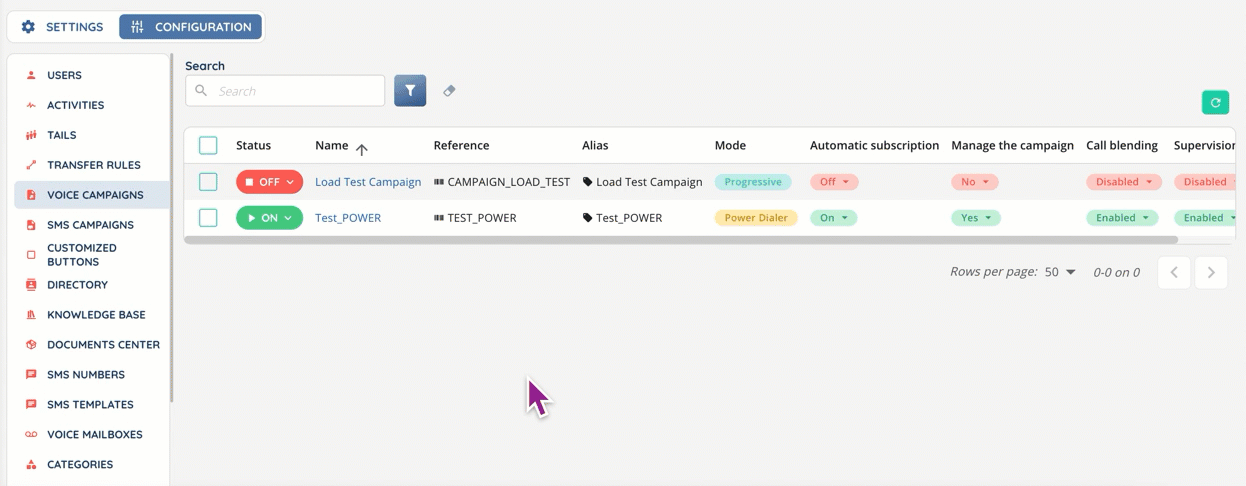 - Activate the option(s) you need in the “Configuration” tab: manage the campaign, call blending, etc.