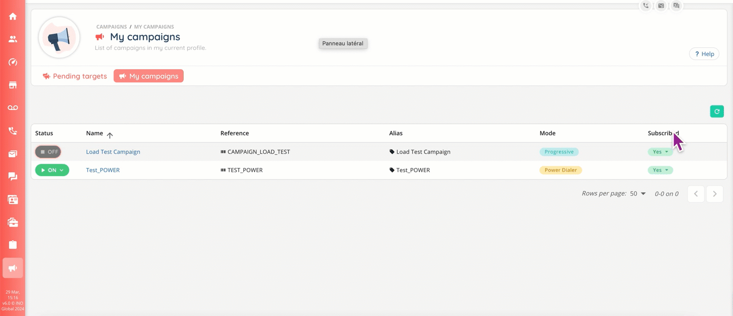 To be visible in the Banner, voice campaigns must be added to the active profile (in the “Configuration” tab). Several parameters can then be activated for more precise management, especially in the Banner.