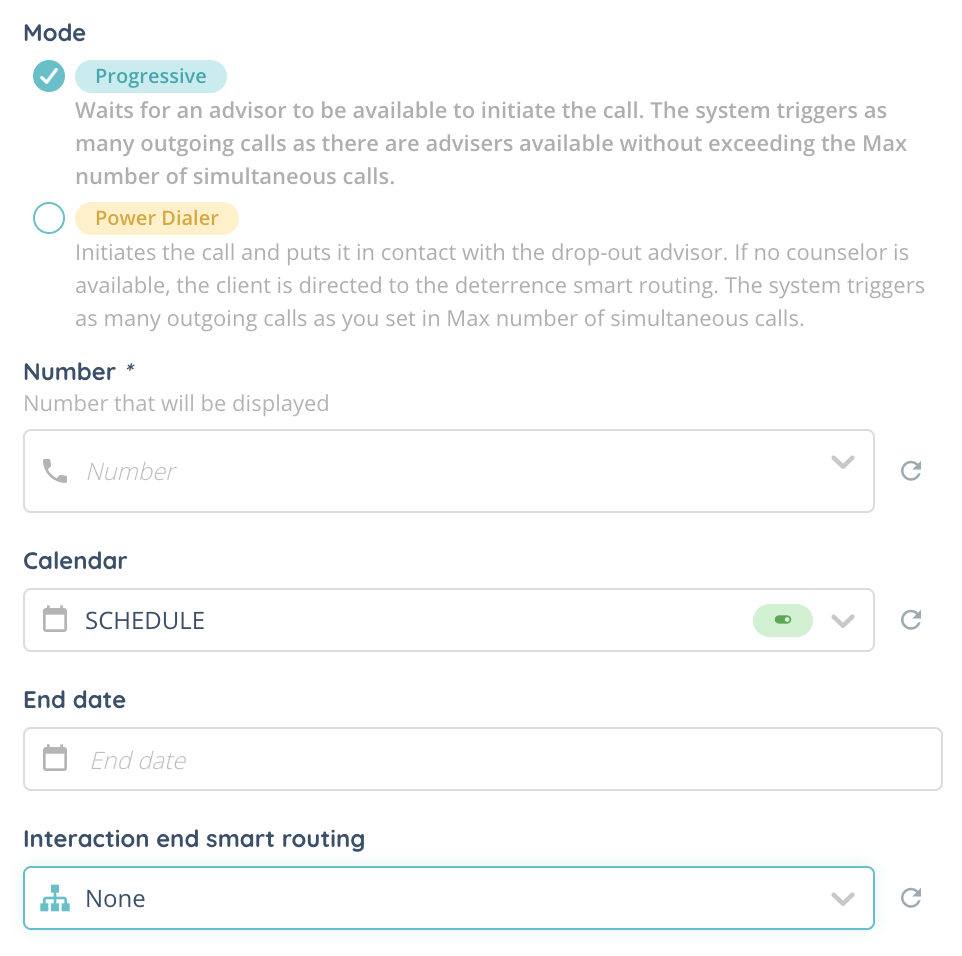 While creating your campaign, you will have to choose between two modes: progressive and power dialer. They change the way calls are made after the campaign is launched.