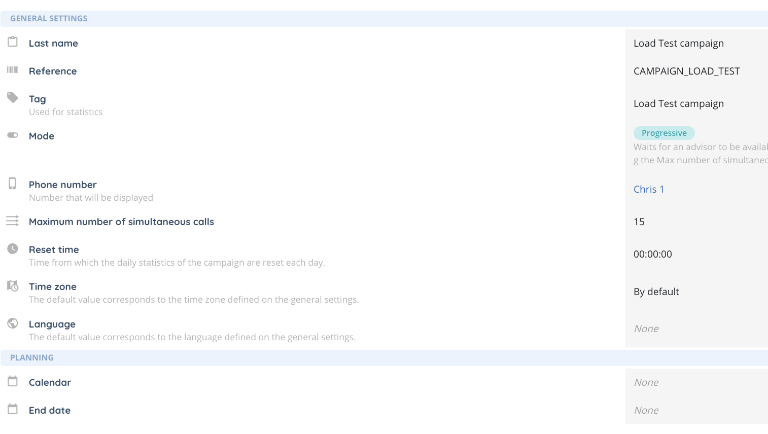 As its name implies, the General section is for the campaign’s core configuration: name, phone number, maximum number of simultaneous calls, etc.