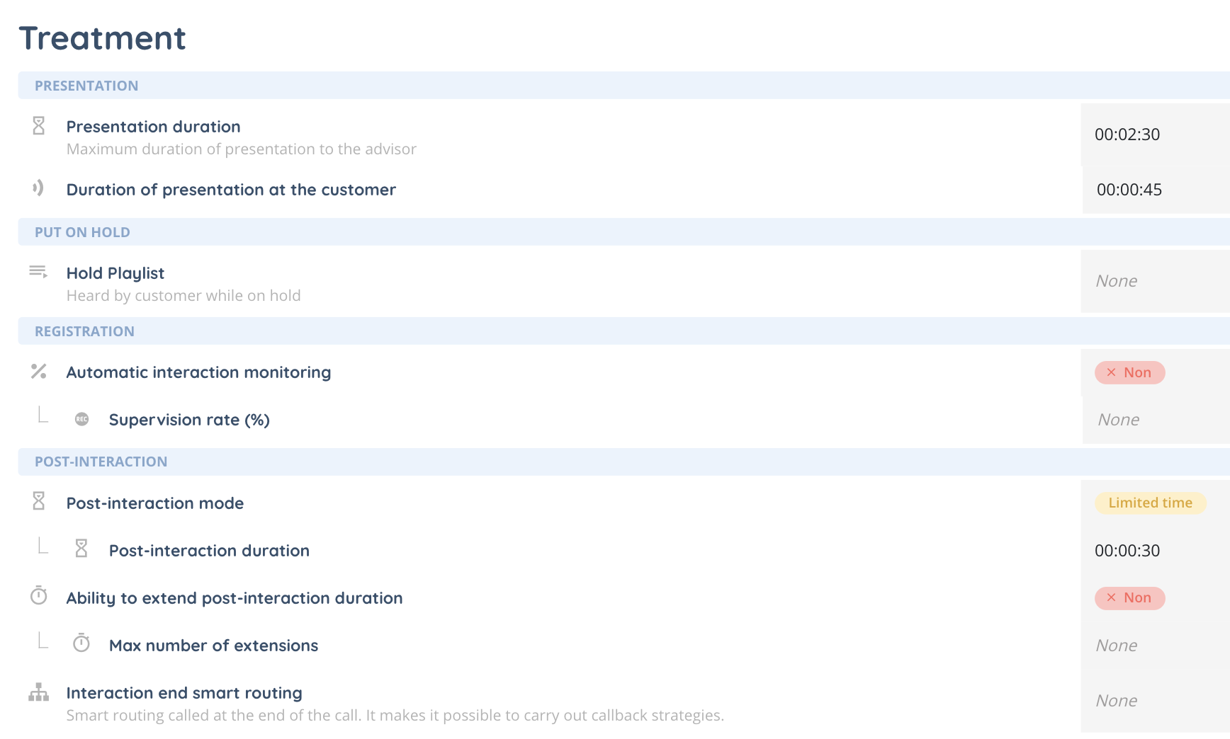 The Treament section is similar to the one you can find in the queue module, with fewer options: presentation duration, hold playlist, post-interaction, stereo recording, repository connector, etc.