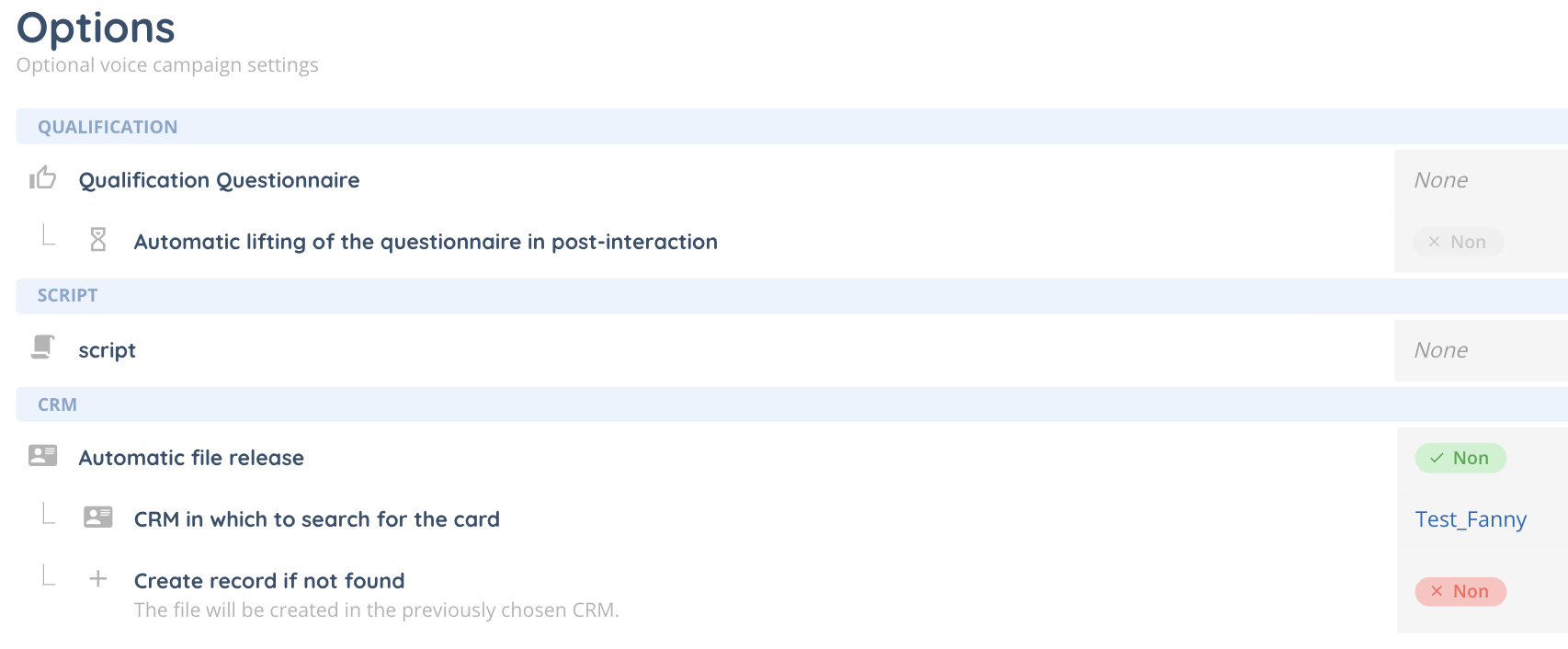 The options section allows you to include a qualification questionnaire, a script, and/or an INO CRM.