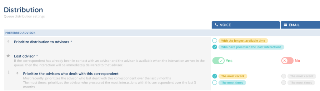 The distribution section controls how interactions are assigned to advisors. You can prioritize advisors with the longest available time or those who have processed the fewest interactions.