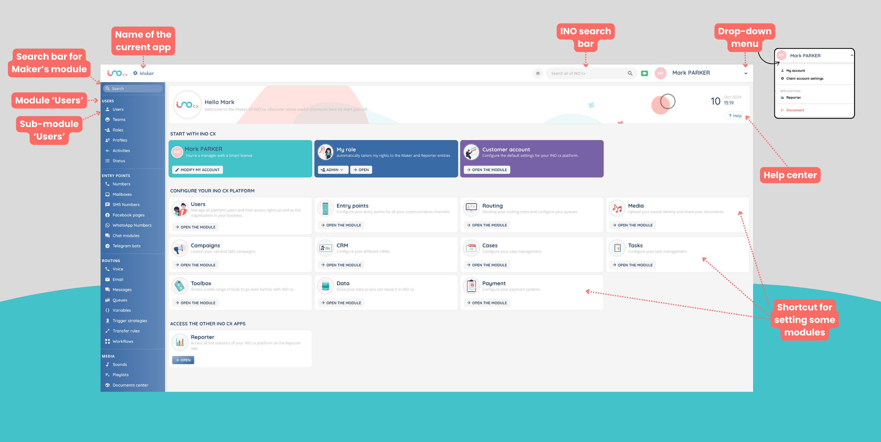 The Maker is one of INO’s 3 applications (Banner, Maker, Reporter) which is used by administrators or managers to set accesses, rights, users, functionalities, routings, etc. which will be displayed in the Banner and in the Reporter.