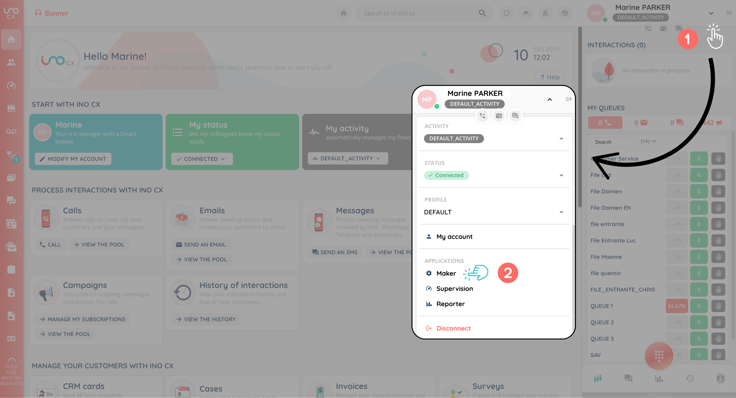 When you log on to INO, you access the Banner directly. To open the Maker, click on the drop-down menu near your user name, called ‘user capsule’ then on “Maker”. The Maker opens in a new tab and the Banner remains open.