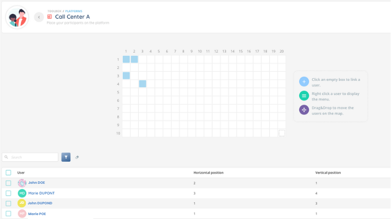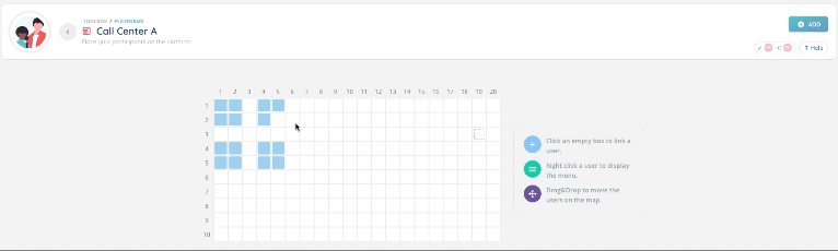 Open your previously created platform, then add as many agents as there are in your call center platform. You can place your agents according to their actual position in the office. A drag-and-drop system makes it easy to move an agent.