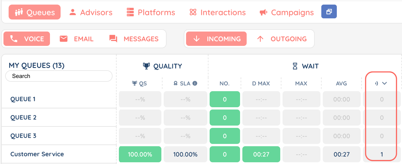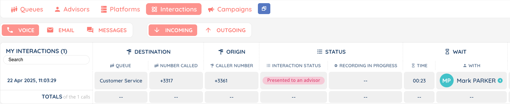 • In the supervision, “queues” tab, a column has been added under the “wait” section, for the number of interactions in presentation. In the “interactions” tab, in the “interaction status” column, a status “presented to an advisor” has been added. In the same tab, a “with” column has been added to indicate which advisor the interaction is with.
