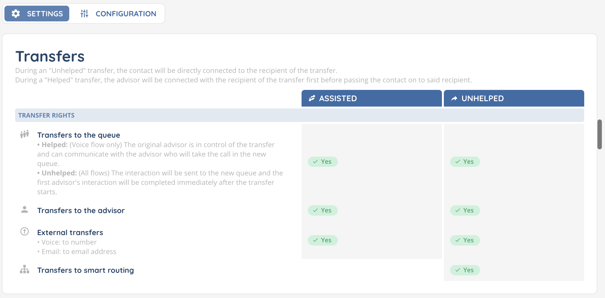 • Accompanied and blind transfer rights can now be activated and deactivated separately in the profile, for voice and messaging channels (default value for new profiles: No. – default value for existing profiles: same value as actual right)