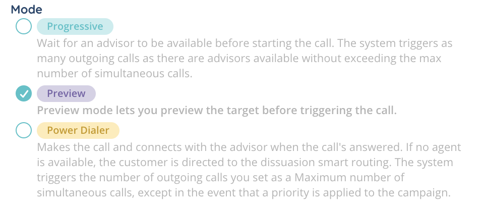 • New mode for voice campaigns: preview. Before launching the call, the agent can preview the target’s info and get prepared for a defined duration. During this time, the agent can manually accept/launch the call or it will be automatically launched at the end of the preview duration.