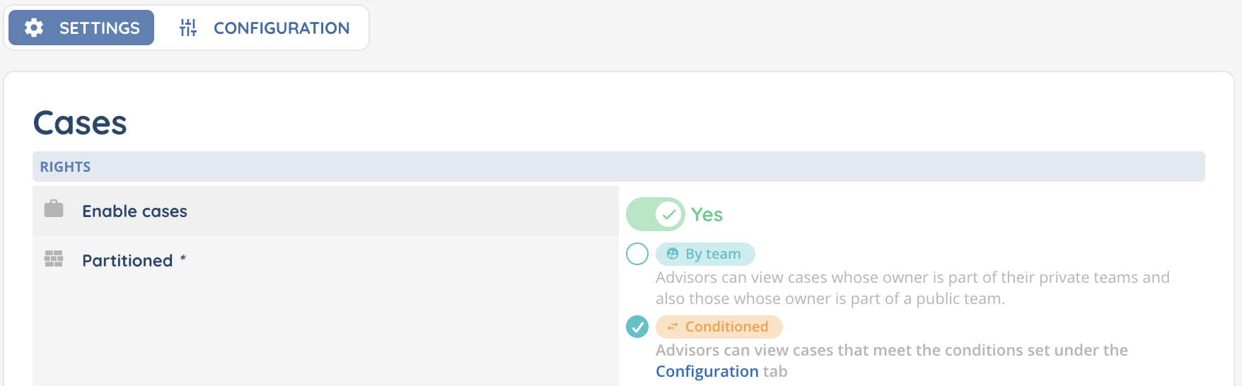 • On the profile, 2 types of partitionings are now possible for cases access: by team (default) or conditioned. So you can now create display conditions on case fields in the profile.
