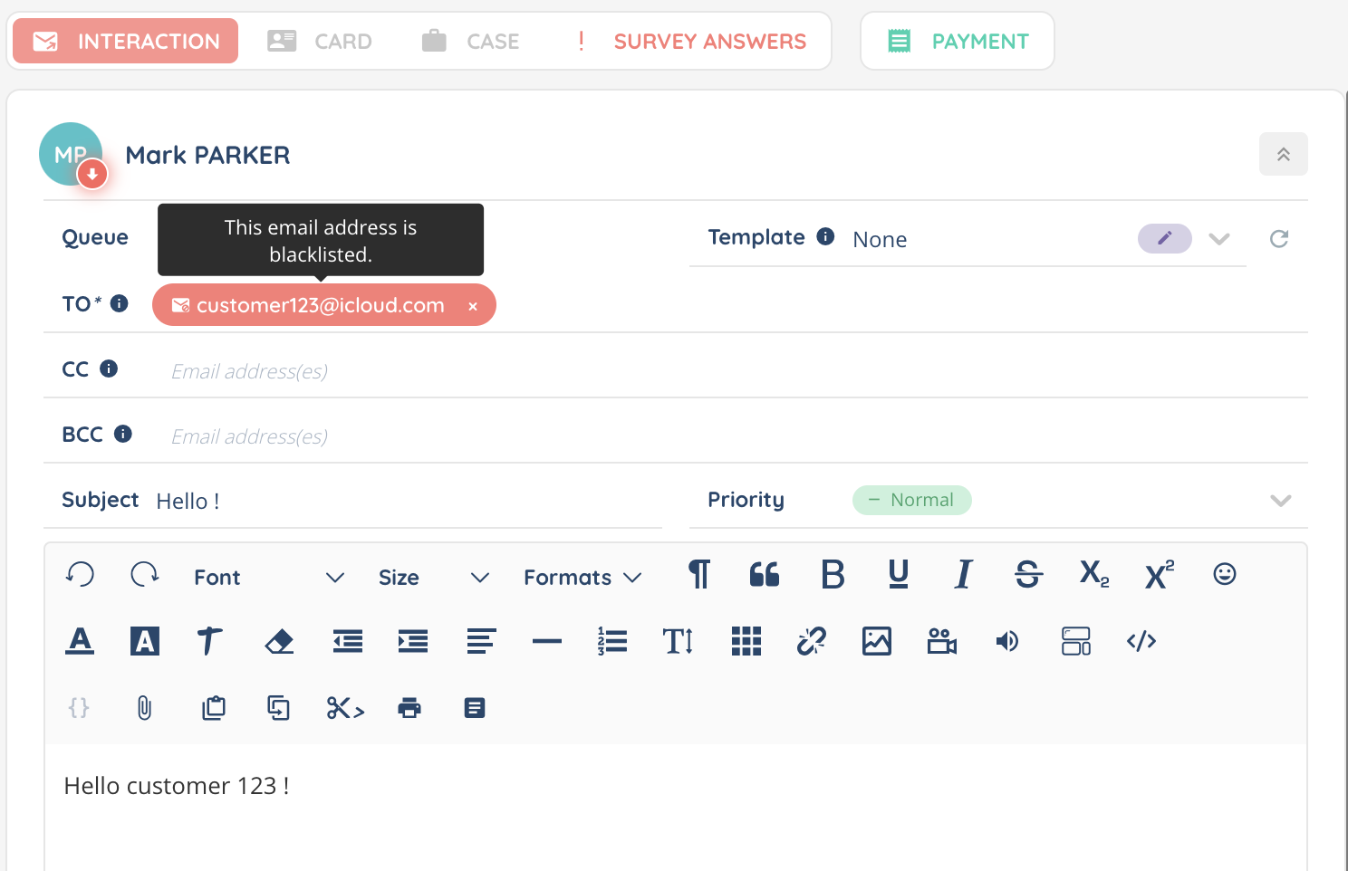 • When trying to send an email to a blacklisted email address, the agent will get a red message.