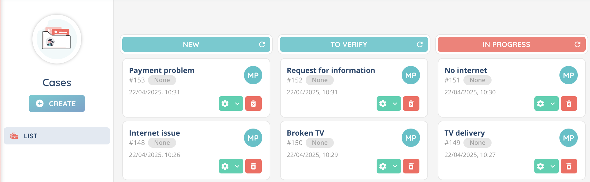 • There are now two possible displays for cases in the Banner : Columns by status or Table. The default view is set in My Account > Preferences. On the Cases module, a new button lets you change the display.