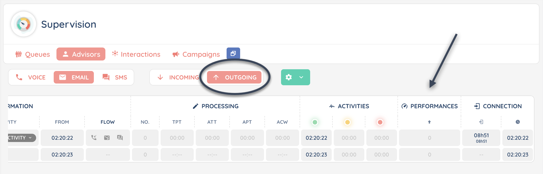 - New “Outgoing” channel tab for the “Advisors” part of the Supervision, with updated “Perfomances” column.