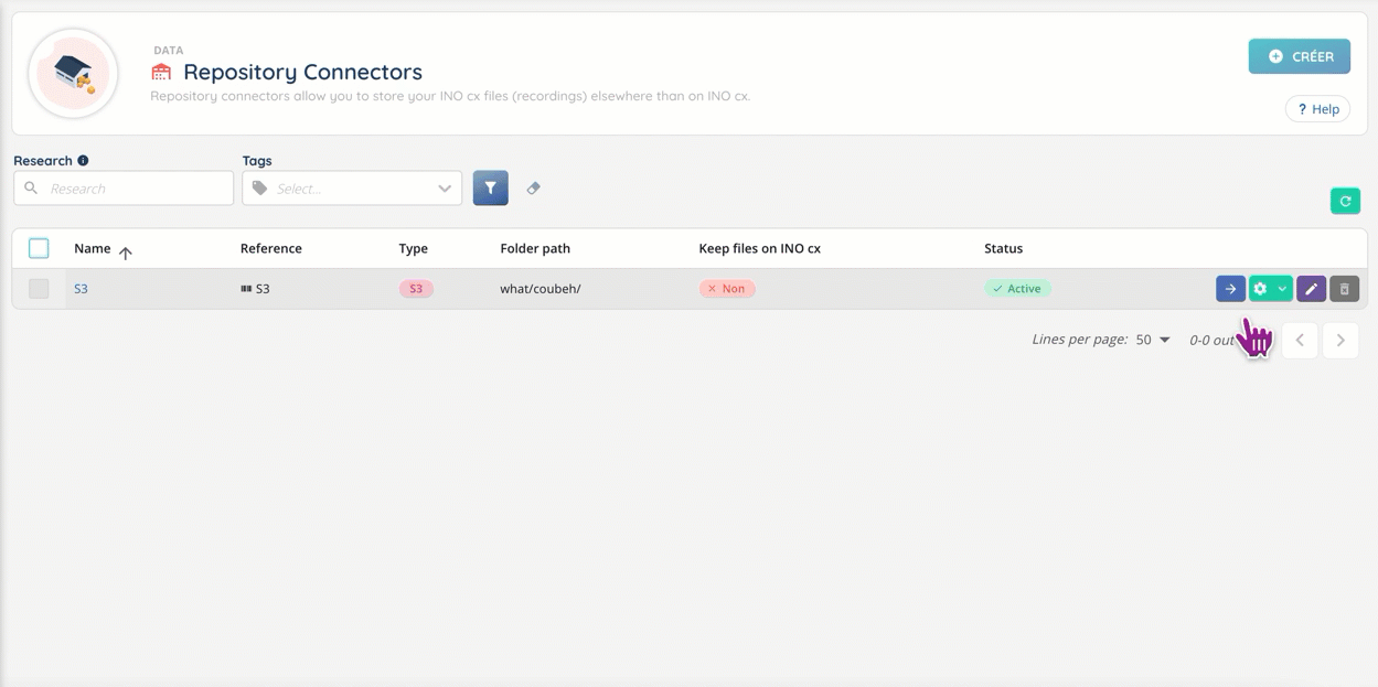 New feature: repository connectors. Data can be kept at INO and/or stored elsewhere. S3 and FTP(S) are available, and a test button lets you check the connection. You can store data from voice mailboxes, queues, IVR recorders and campaigns (voice only).
