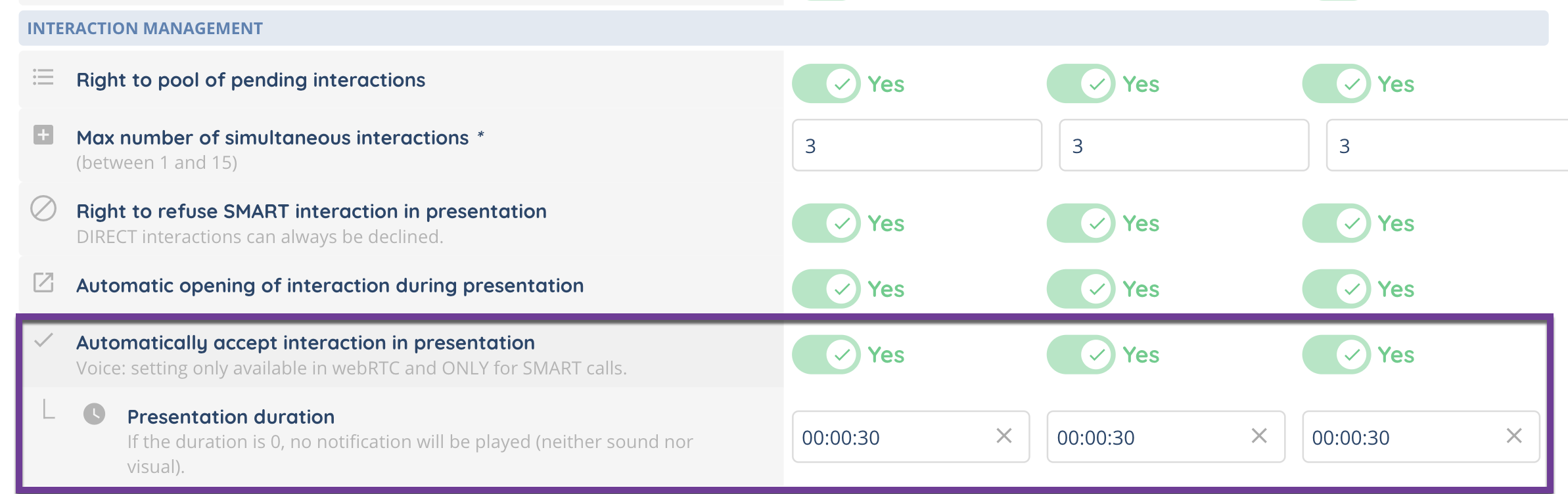 - Timing of interactions on automatic acceptance: it is now possible to set a presentation duration, so all advisors can hear the ringing notification.