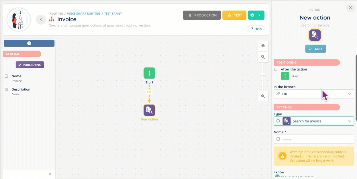 - The Smart routing action “Pay an invoice” has been harmonized with “Search for an invoice”.