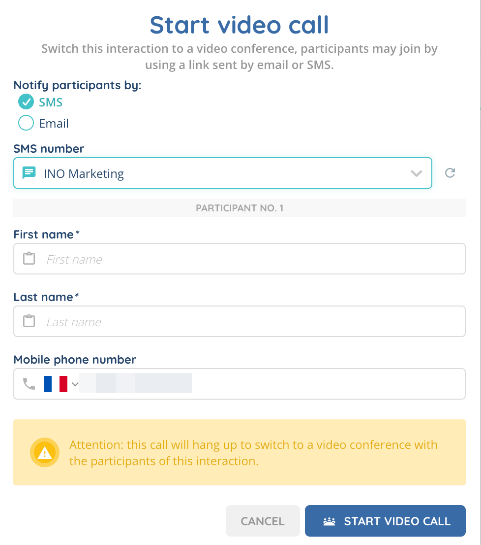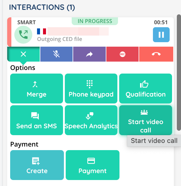 - New feature: start a videoconference (from voice or messaging interactions). Once rights have been activated in both queue and profile, a new button appears in your interactions’ “Options” menu. For calls, the agent can generate an invitation link to be sent to call participants by SMS or email, and in all cases, the agent is automatically connected to the visio. Once the videoconference has been launched, the voice/messaging interaction ends.