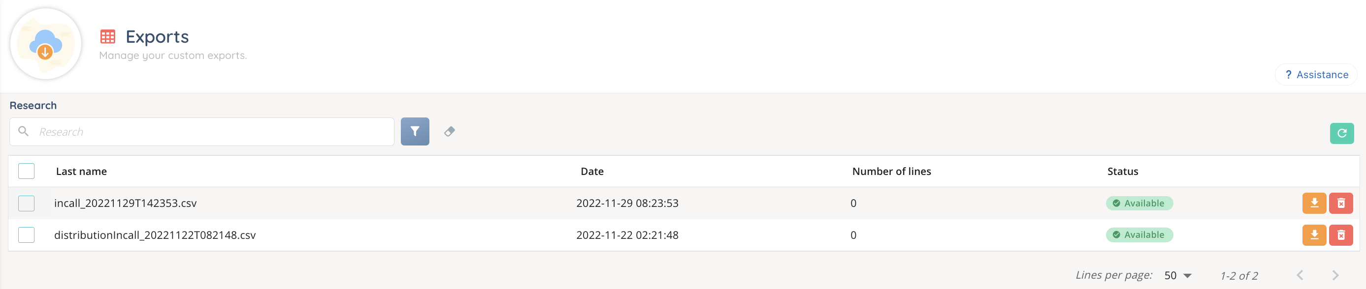 The exports are generated from the data sources, and are then available in the dedicated tab. You can download them in .CSV format.