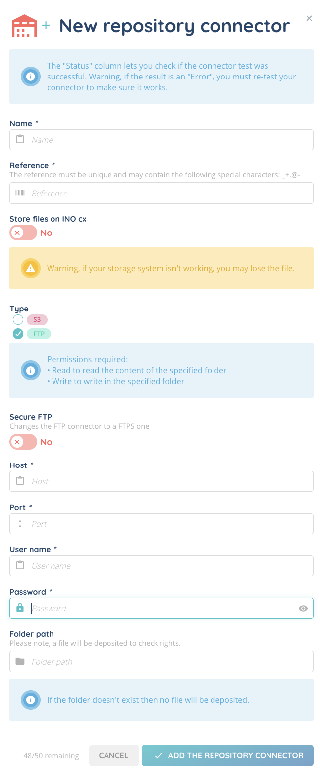 A repository connector is a link between INO cx and an external storage space, allowing files to be saved outside INO cx servers. By default, files are stored within INO cx, but they can also be stored on a repository connector or only on it.