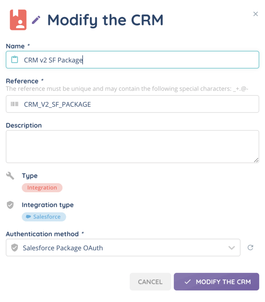 - Create a new CRM v2 of type Salesforce, using the authentication method created earlier.