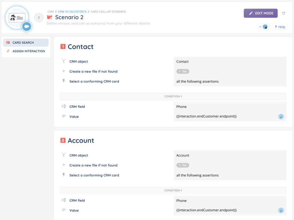 - Screen pop: e.g., search in Contact first, then in Account if not found.