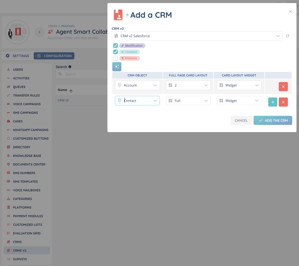 To make the CRM available in the Banner, associate the Salesforce CRM v2 with the relevant profiles.