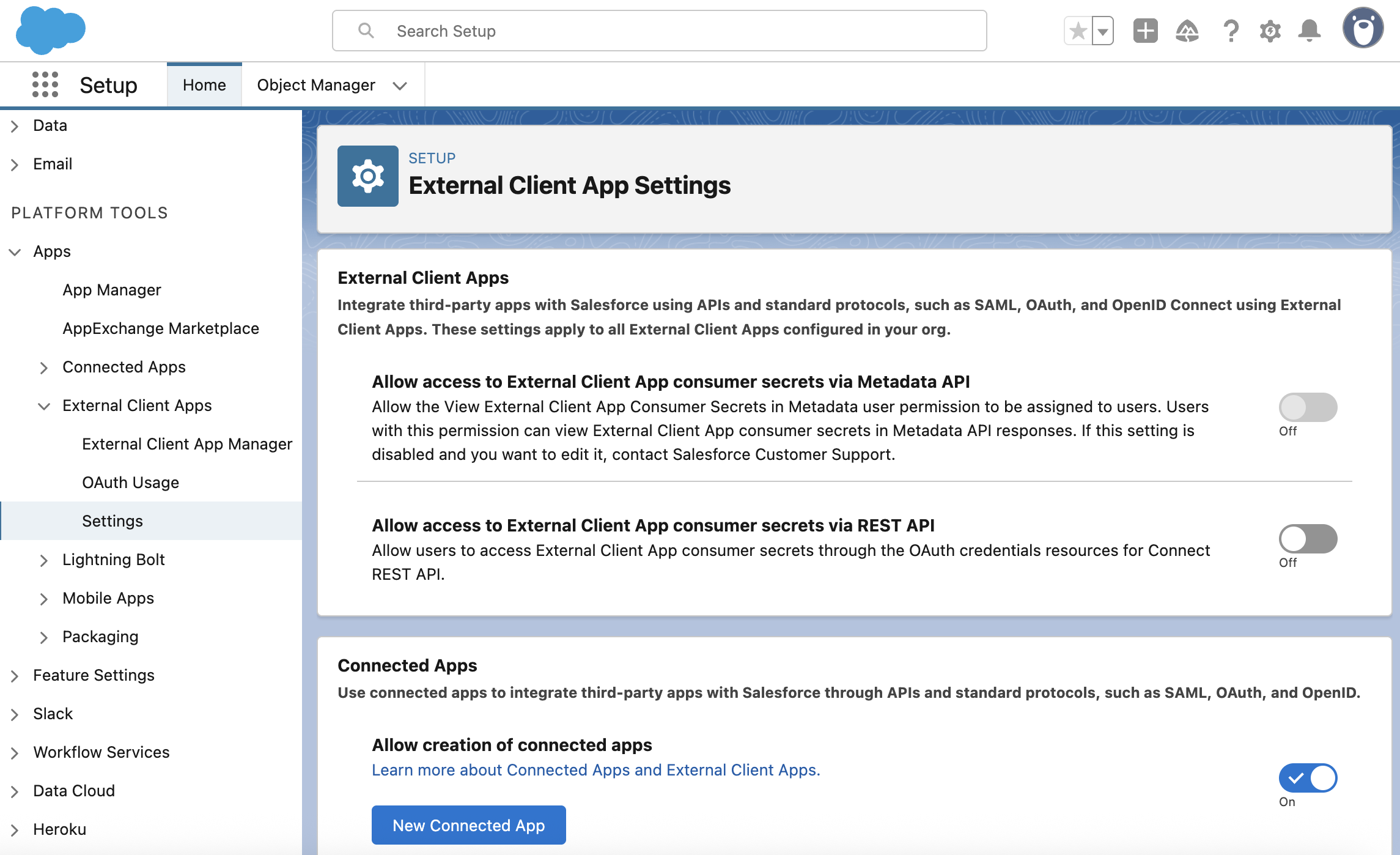 - To enable the creation of connected applications, go to the Set up menu > Apps > External client apps > Settings.