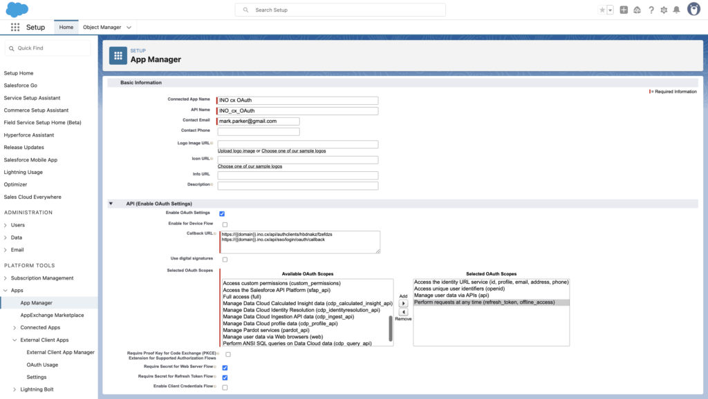 The connector requires configuration both on the Salesforce side (package installation, connected app, custom fields) and on the INO cx side (authentication method, CRM v2 setup, scenarios, and profile association).