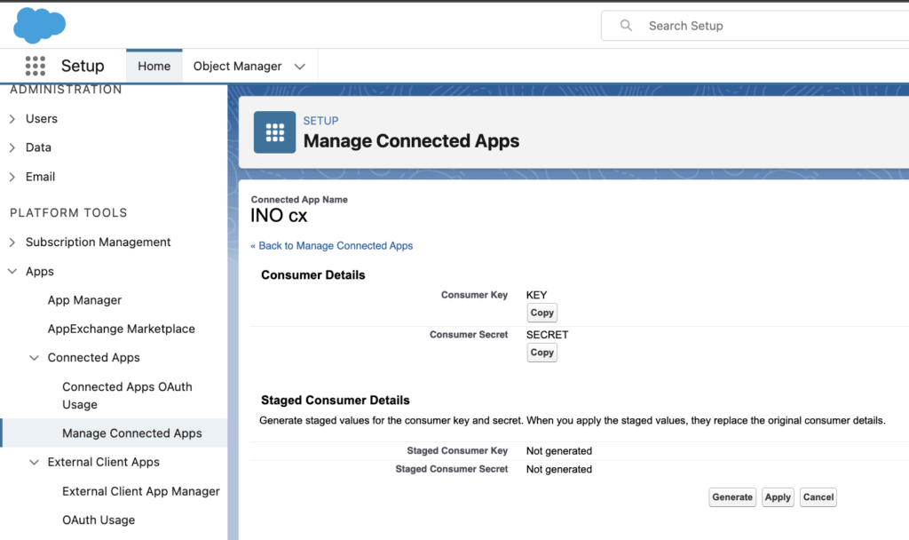 - Save, open Manage connected applications, then click Manage consumer details, and note the Consumer Key and Consumer Secret (required for INO cx).