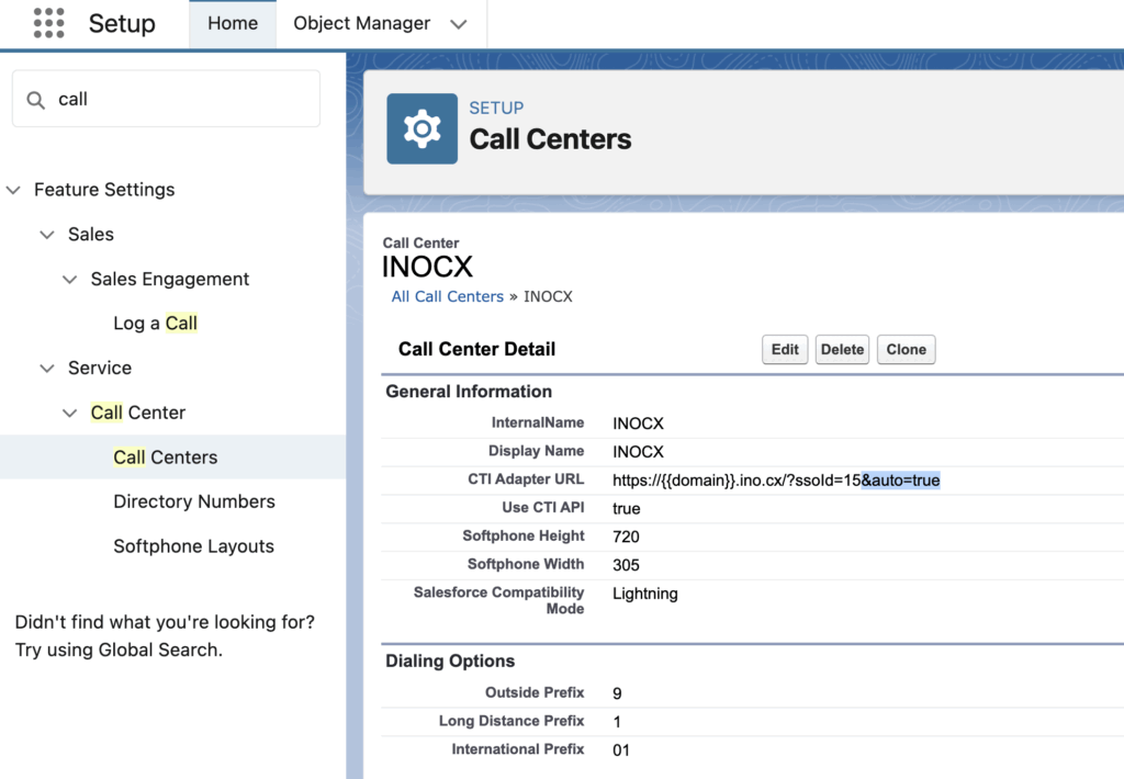 - Edit the INO cx call center: enter the URL found in the SSO section of this article (see below) and add &auto=true at the end.