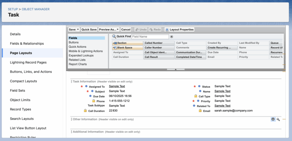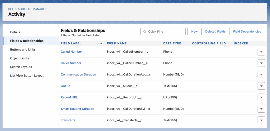 You must also add these custom fields to the Task object layout so that INO cx data is visible within the Salesforce interface.