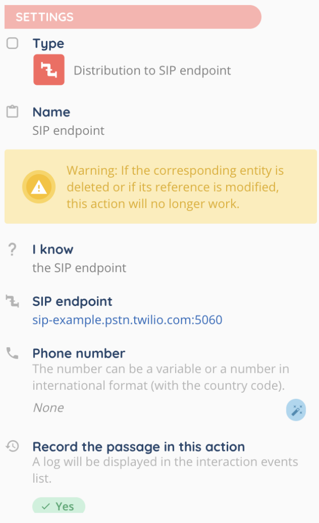 Once configured, a SIP endpoint can be used in voice smart routing scenarios to send calls to an external telephony system.