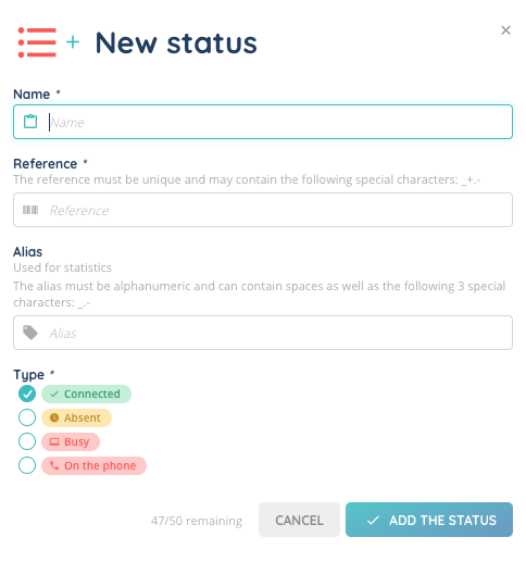 The status enables agents to inform their colleagues of their availability or current situation. They are for purely informative and internal use, with no direct impact on flows or processes. Unlike activities, which influence the flows activated for the agent, statuses are only used to communicate a presence or status update.
