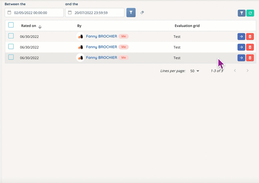 It is possible to rate one or more recordings at a time, as well as to leave a comment for a specific part of the record. The assessment grid(s) must be added to the profile in order to be used.