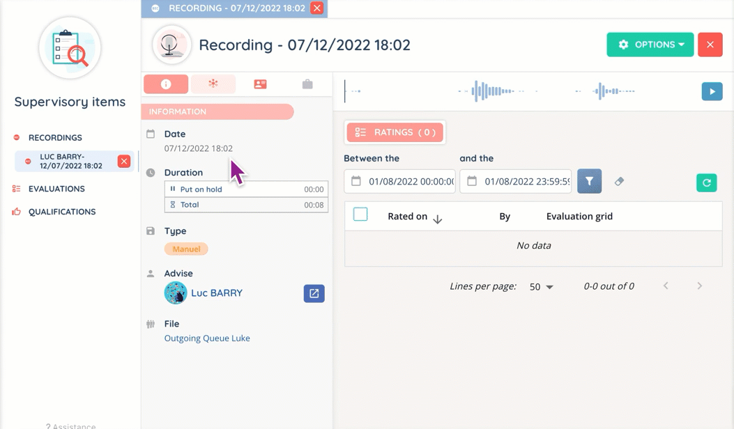 - Information: where the interaction’s details are displayed. For example, the date and time, the duration of a call (with waiting time), the type of recording, the agent (and a button to access the interaction history), and the queue.