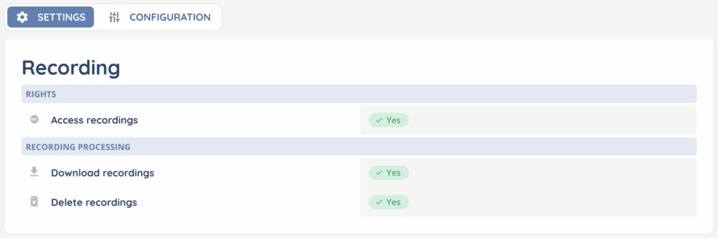 Each right related to recordings (access, download, delete) can be configured in the profile.