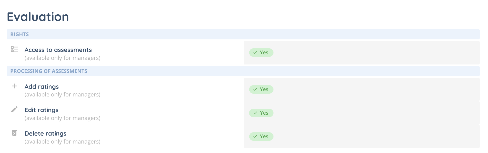 Like the records, each right related to the assessments is set in the profile.