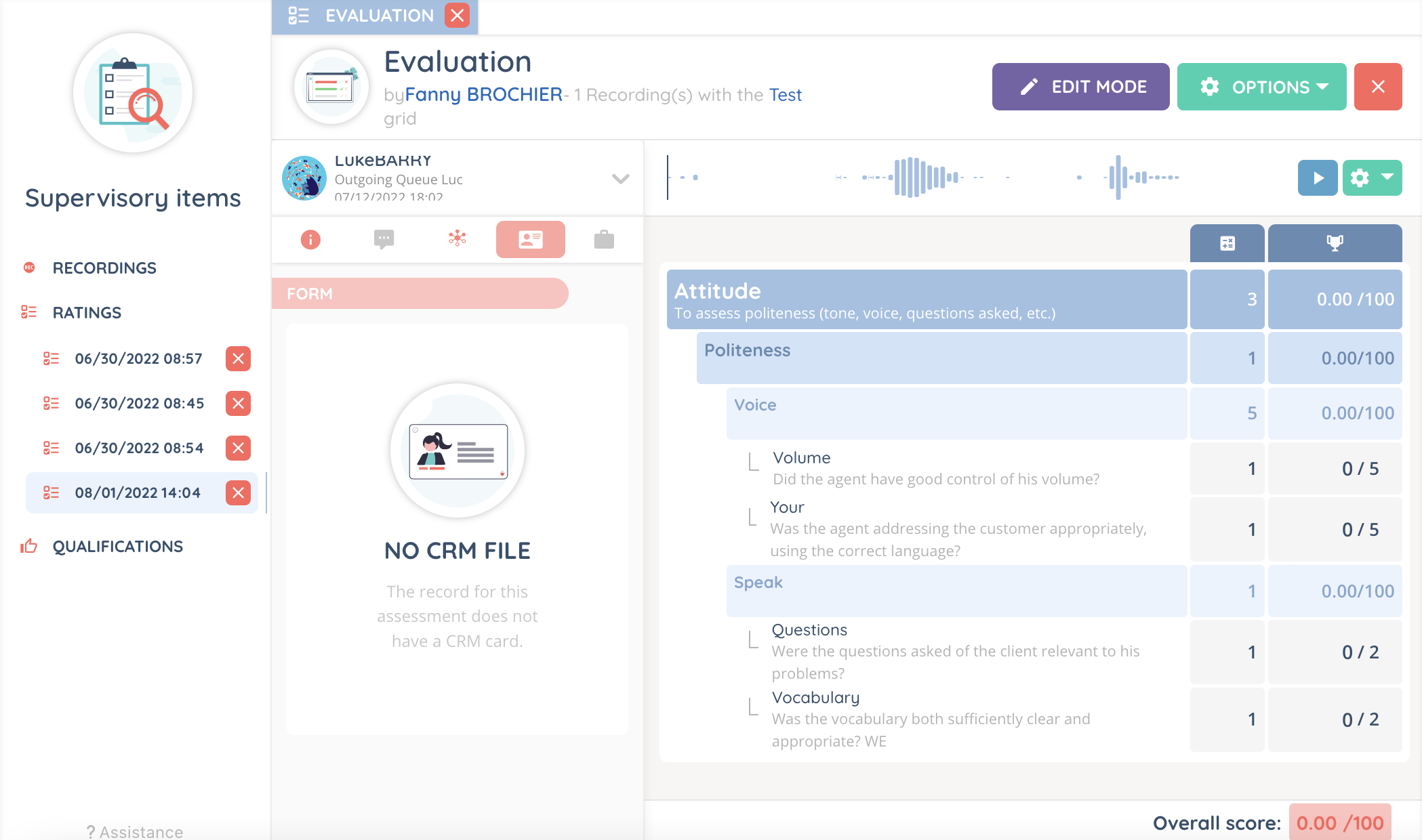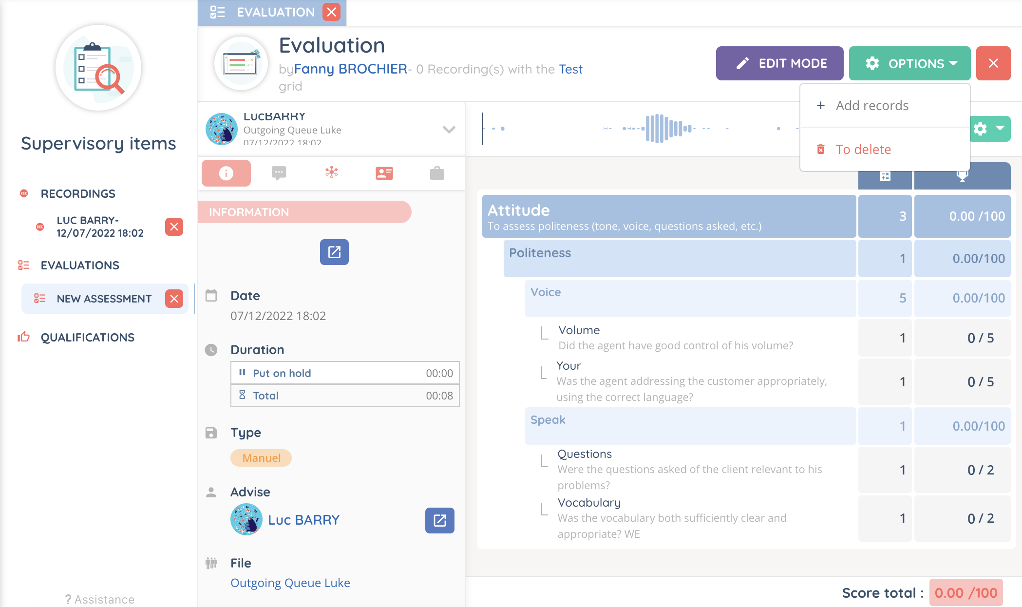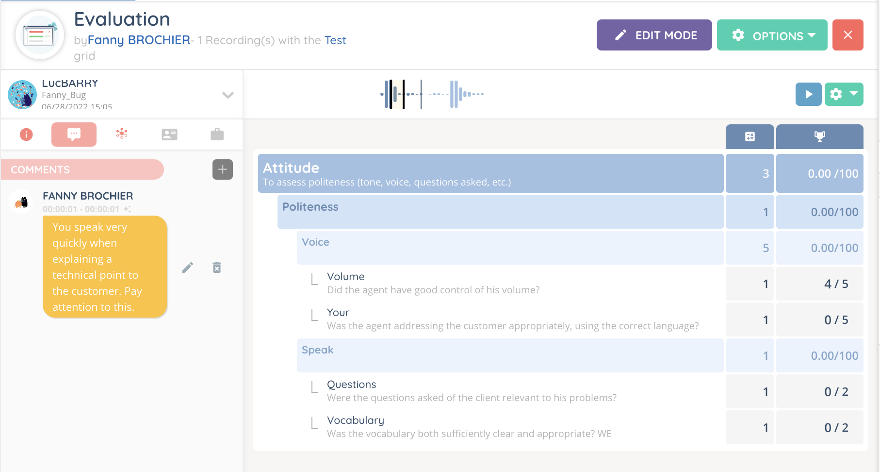 It is possible to rate one or more recordings at a time, as well as to leave a comment for a specific part of the record. The assessment grid(s) must be added to the profile in order to be used.