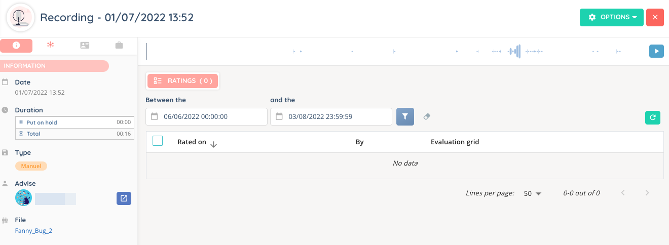 - Information: where the interaction’s details are displayed. For example, the date and time, the duration of a call (with waiting time), the type of recording, the agent (and a button to access the interaction history), and the queue.