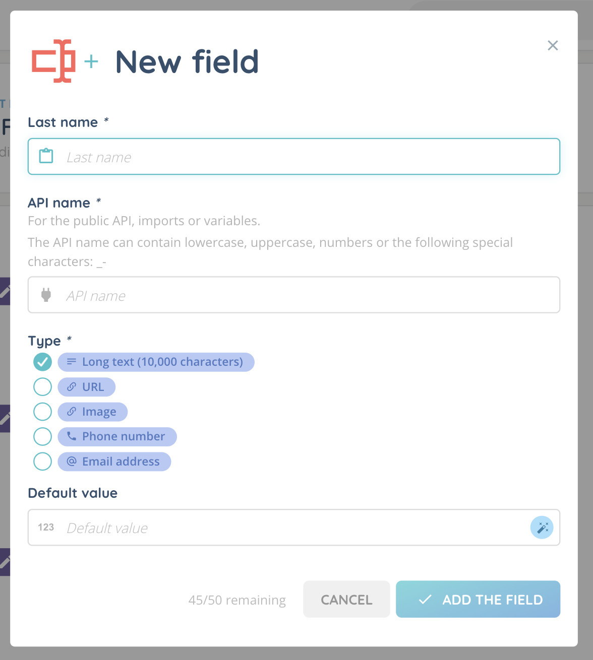 Once you have entered a name and an API name, you can assign a field type, to be chosen from the list.