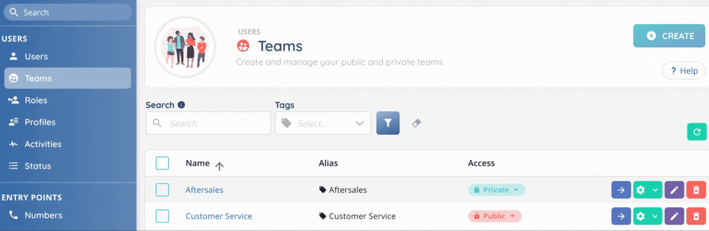 A team can be used to group together one or more users according to their department (sales, aftersales, marketing, QA, etc.) or any other criteria.