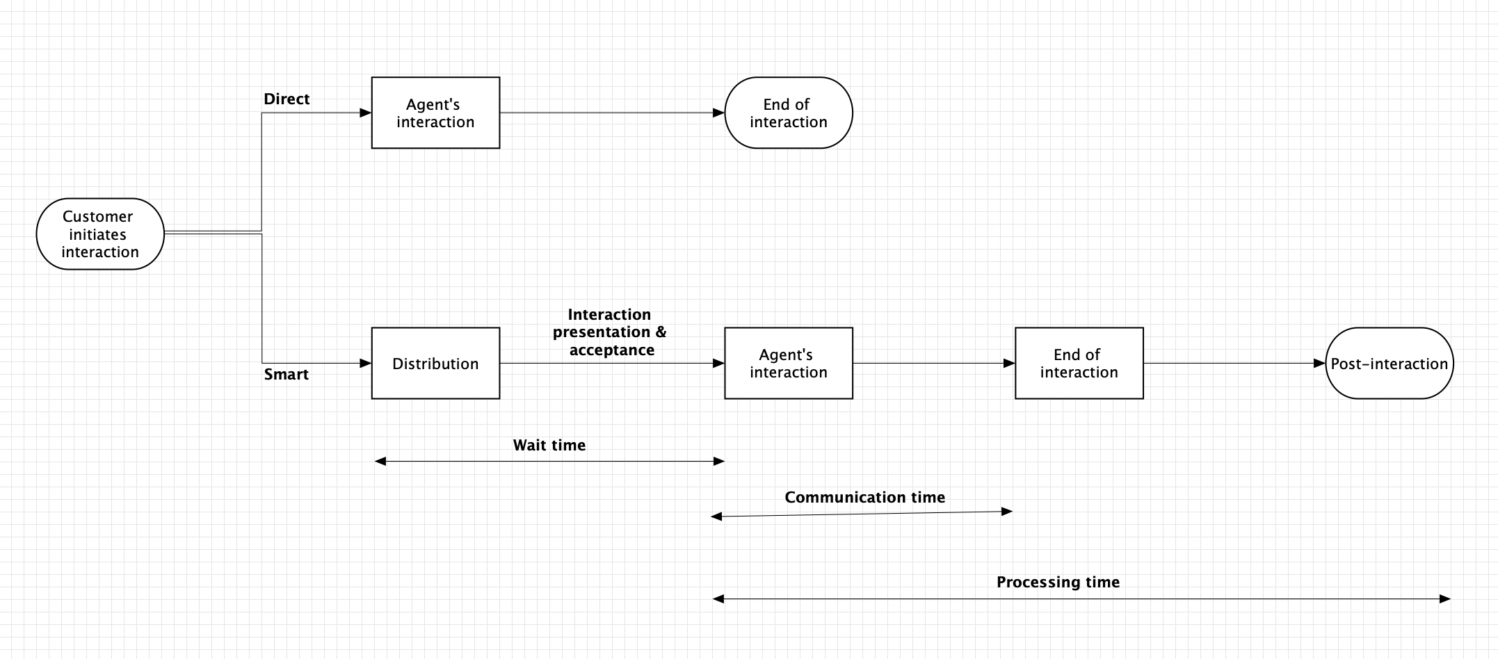 Processing time begins after distribution, when the agent/customer accepts the interaction. It ends with the start of the post-interaction (if the agent fills in a qualification questionnaire, for example).